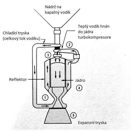 Jaderný raketový pohon je dle mně řešení našeho problému vydává ještě větší výkon než kapalný vodík a kyslík, například zatím nejvýkonější jaderný motor vyvynul tah jedné třetiny celého prvního stupě rakety Saturn V. Ovšem to není vše tento motor totiž nepotřebuje kapalný kyslík čímž ušetříme spoustu hmotnosti. Tento SSTO by nás na orbitu dostal ale, neměl by nijak zázračnou nosnost, podle mých odhad by vynesl na orbitu sám sebe několik kosmonautů a párset kilogramů nákladu. Ale to přece není dostačující, proto mně napadá proč prvních třicet kilometrů používat vodík když je všude okolo vzduch. Proudový a raketový jaderný pohon jsou téměř stejné až na to že v raketovém motoru expanduje palivo a v proudovém vzduch. Proto jsem se rozhodl ž prvních třicet kilometrů bude náš raketoplán letět jako letadlo s jadernými proudový poté přestane do motoru proudit vodík nabereme rychlost a vyletíme zbývajících 70km. Díky tomuto řešení by jednostupňové rakety mohli mít nosnost klidně několik tun na LEO a nejspíš by byli schopny vyletět i na GTO.